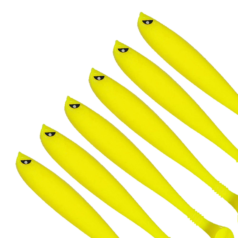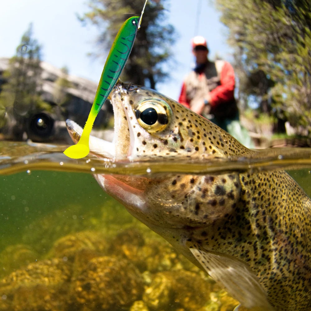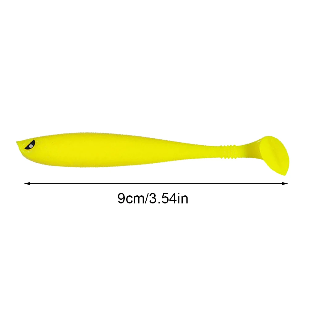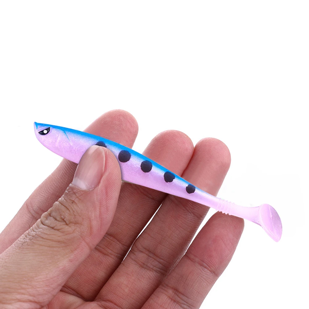 6Pcs Artificial Soft Bait 9cm Fishing Lure Minnow Multifunctional Fishing Bass Carp Lure for Saltwater Freshwater Features: 1. Stunning Appearance: The T-tail fishing soft bait boasts a meticulously designed shape, renowned for its unique T-shaped tail. This design not only enhances the lure's visual appeal but also ensures natural and smooth movement in the water. 2. Supple Texture: Made from highly flexible plastic material, the T-tail fishing pike bait mimics the muscle texture of real fish. Its flexibility adds lifelike dynamics to its swimming motion, effectively capturing the attention of fish. 3. Remarkable Realism: With its lifelike design and color selection, the T-tail bionic soft bait is exceptionally realistic underwater, making it difficult for fish to distinguish it from real prey. It serves as a great bait to attract various freshwater and saltwater fish species. 4. Versatile Applications: The fishing T-tail bait finds multiple uses in fishing, baiting, and swimming exercises. It can be attached to the fishing line as a bait or used as swimming equipment for aquatic activities. 5. Exceptional Durability: Manufactured with high-quality materials, the artificial soft bait exhibits outstanding durability. It is resistant to wear and deformation, maintaining its original condition even after prolonged use.